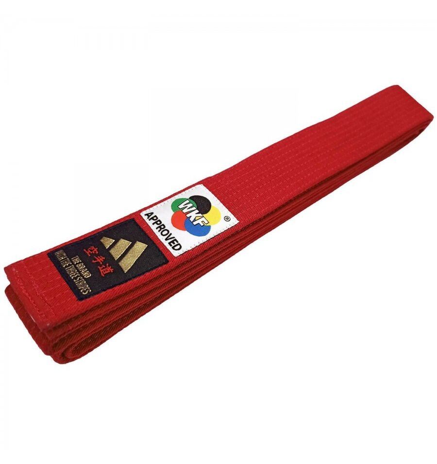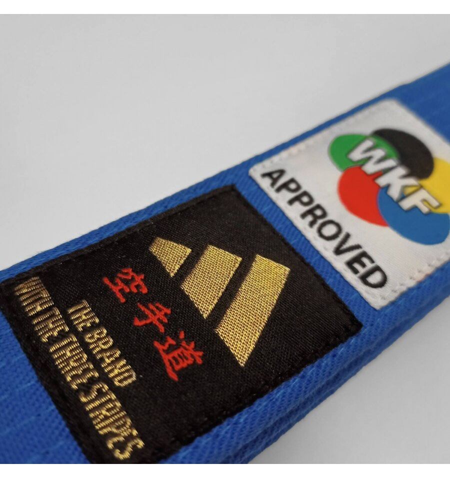 Cinturón Elite aprobado para competencias con logo WKF y logo adidas. Ancho de 45mm. Colores negro, azul y rojo.