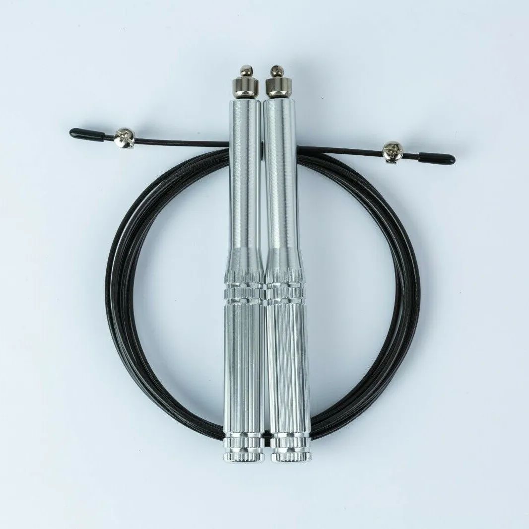 Soga de saltar con agarre de aluminio. Para entrenamiento avanzado de velocidad y agilidad. Color plateado.